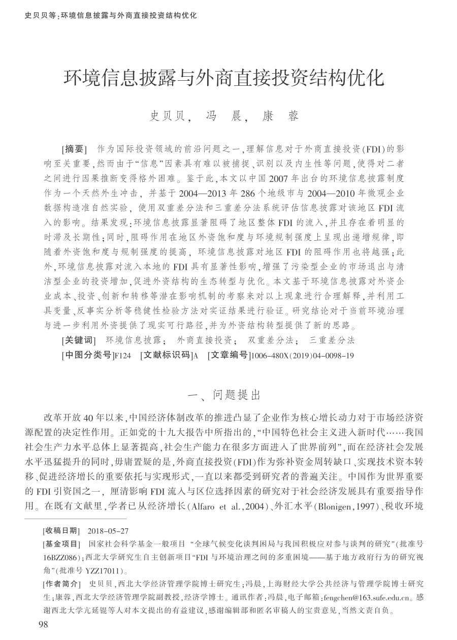 文章以我国2007年出台的环境信息披露制度出发,基于2004—2013年286个地级市与2004—2010年微观企业数据构造准自然实验,使用双重差分法和三重差分法评估了信息披露对地区FDI流入的影响。结果发现:环境信息披露显著阻碍了地区整体FDI的流入,并且存在着明显的时滞及长期性;同时,阻碍作用在地区外资饱和度与环境规制强度上呈现出递增规律,即随着外资饱和度与规制强度的提高,环境信息披露对地区FDI的阻碍作用也将越强;此外,环境信息披露对流入本地的FDI具有显著性影响,增强了污染型企业的市场退出与清洁型企业的投资增加,促进外资结构的生态转型与优化。文章同时基于环境信息披露对外资企业成本、投资、创新和转移等潜在影响机制的考察来对以上现象进行合理解释,并利用工具变量、反事实分析等稳健性检验方法对实证结果进行了验证。