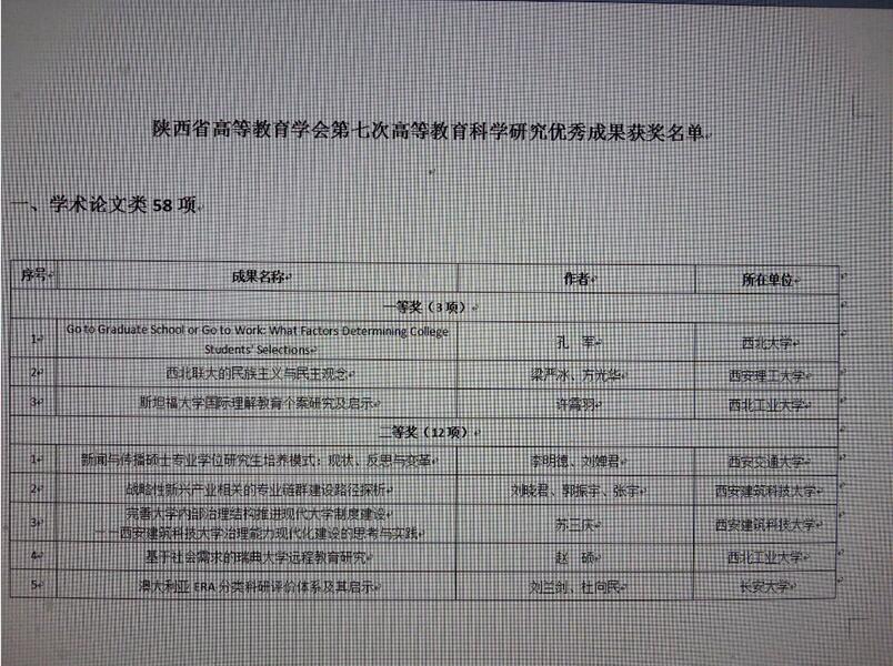 我院孔军副教授的论文《Go to Graduate School or Go to Work: What Factors Determining College Students’Selections?》获得陕西省第七次高等教育科学研究优秀成果奖一等奖,在12月3日举行的陕西省高等教育学会年会暨校长论坛上受到表彰。这篇文章在SSCI检索期刊The Anthropologist上发表(2015, Vol.19(3), pp.773-780)。