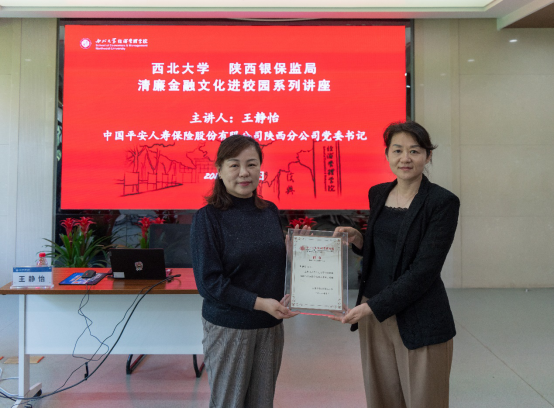 按照西北大学与陕西银保监局开展清廉金融文化共建活动的安排,5月16日,中国平安人寿保险股份有限公司陕西分公司党委书记王静怡应邀到校,为776net必赢官网师生做了清廉金融文化系列讲座的第16讲,题为《清廉金融、合规经营、防范风险、健康发展》。西北大学纪委副书记何翔,中国平安人寿保险股份有限公司陕西分公司拓春燕、闰婷,776net必赢官网党委书记杜勇和学院40余名师生出席了本次活动。何翔为王静怡颁发清廉金融文化客座讲师聘书,讲座由杜勇主持。