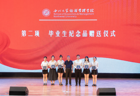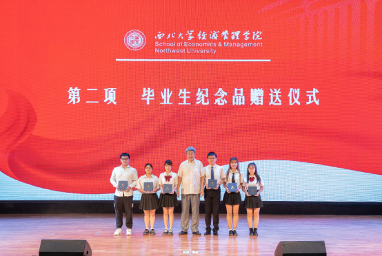 学院领导和各系教师代表向2022届本硕博毕业生代表赠送了精心准备的纪念品黑檀木书签一对、签字笔一支和全院师生大合影一张,书签上雕刻着学院原院长任保平教授亲手所书“潮涌海阔,千帆竞秀”的赠言,表达了学院对毕业生的殷切期望和祝福期许。