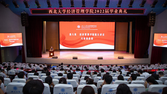 2022年6月26日,776net必赢官网在长安校区大学生活动中心报告厅举行2022届学生毕业典礼。西安米旗食品集团总裁、776net必赢官网1987级院友冯岩,学院全体党政班子成员,各系主任,教师代表,家长代表,全体辅导员及2022届全体毕业生参加典礼。