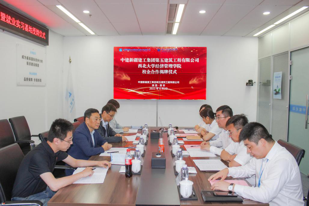 薛孟斌和杜勇共同签署校企产学研合作协议,并为“西北大学就业实习基地”揭牌。揭牌仪式后,双方参会人员就五建发展历程、陕西分公司发展趋势、学校发展历程与加强校企合作、产教融合方面进行深入交流。