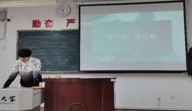 首先,由城市环境与工程学院的同学进行了PPT展示,对“什么是碳中和、碳达峰”进行了解读,其次从地理和经济角度阐述了实现“碳中和”、“碳达峰”的路径和方法。